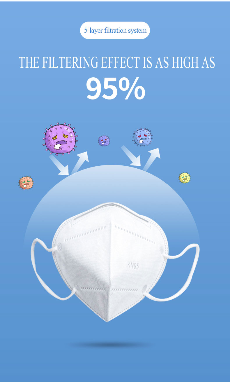 1. Suodattavuus täyttää GB2626-2006 KN95 -standardin vaatimukset. 2. Suodatustehokkuus - 99%. 3. Hiukkasten suodatuksen hyötysuhde - 95%. 4. Se on mukava käyttää ja sillä on hyvä hengittävyys. 5, 3 suodatinkerrosta, turvallisempi suoja. 6. Estää tehokkaasti PM2,5: n, pisaroiden, siitepölyn ja muiden hiukkasten pilaantumisen ja vastustaa niitä, eristää bakteerit, virukset ja epäpuhtaudet. Se on turvallinen suojanaamio. 7. materiaali: Kuitukangas, sulapuhallettu suodatinmateriaali 8. tuotteen pakkaus: 40 kpl / laatikko, 1000 kpl / pakkaus 9. varastointiaika: 36 kuukautta